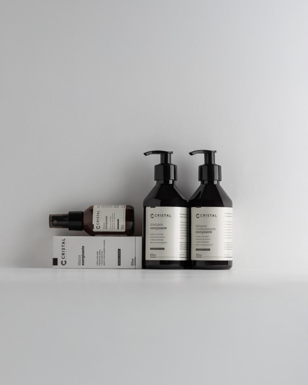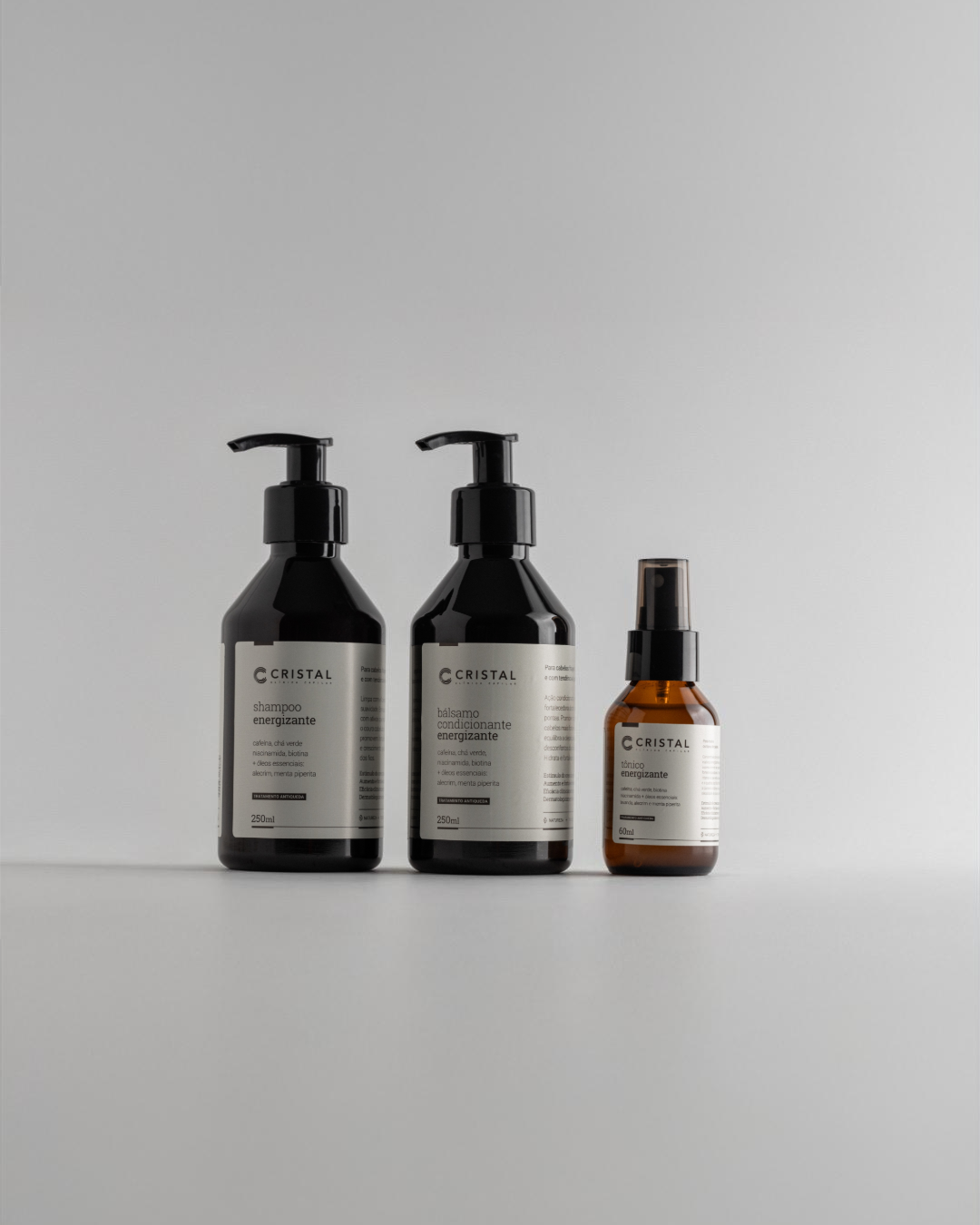 Shampoo Energizante – Aplique no couro cabeludo molhado, massageando suavemente. Enxágue bem.